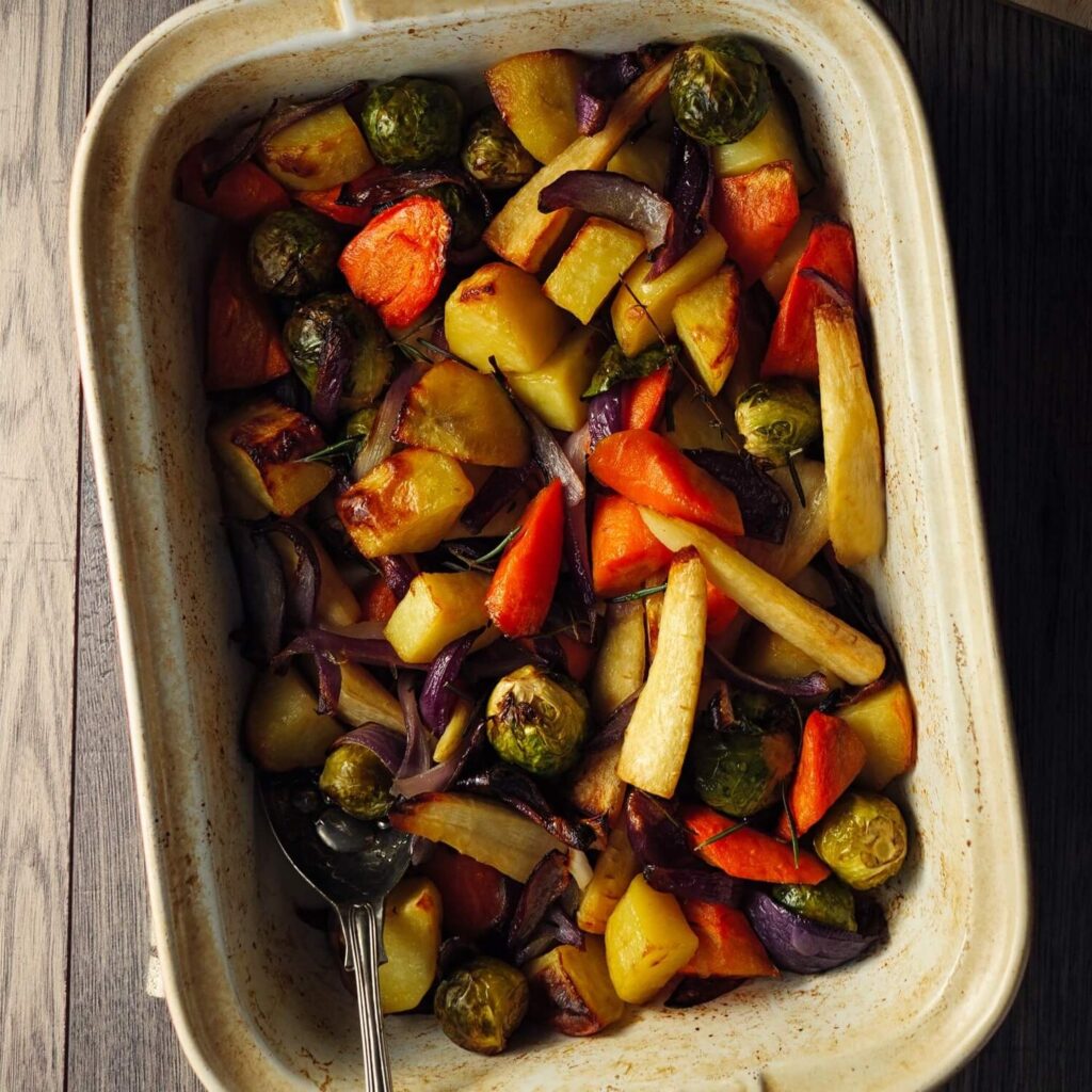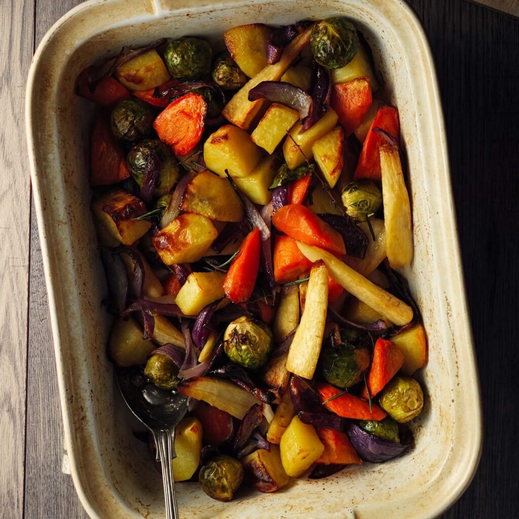 - Child: Place the roast potatoes, parsnips, carrots, Brussels sprouts, and pigs-in-blankets directly onto the baking tray. No extra bowls needed!